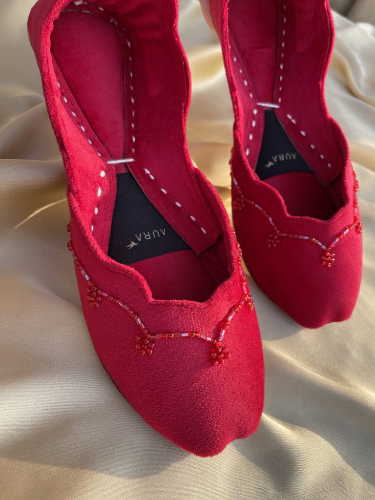 Elevate your style with the color of extreme bliss red footwear finely decorated with small-sized beads and red threads. Duly designed to align the ethnic charm.Â