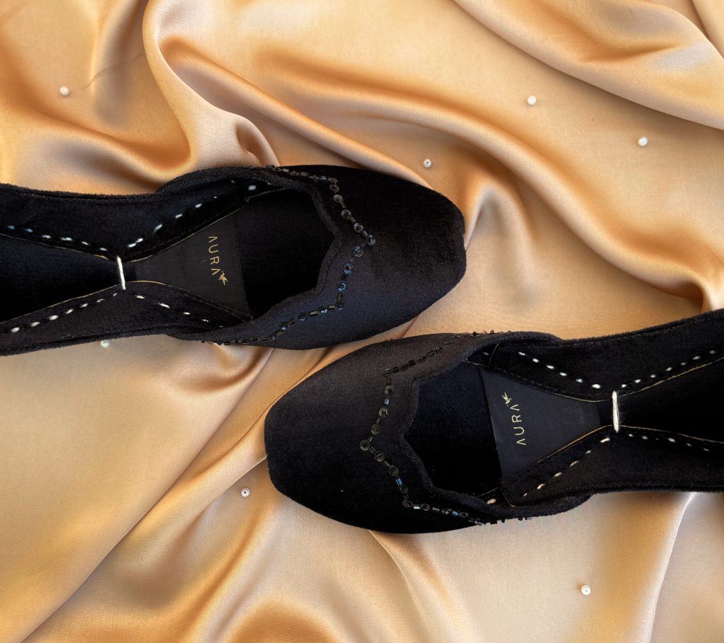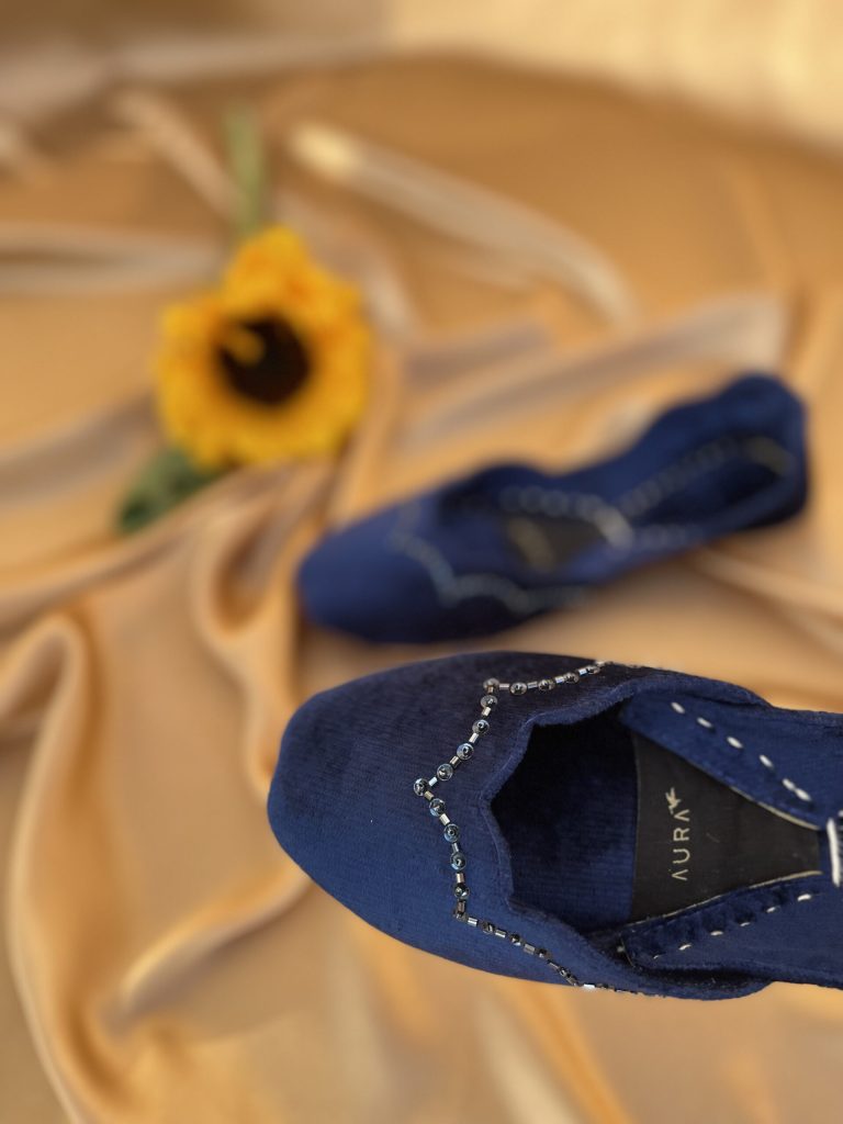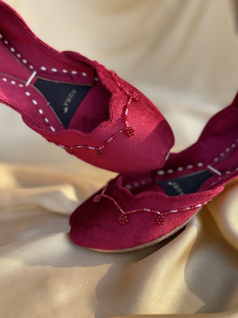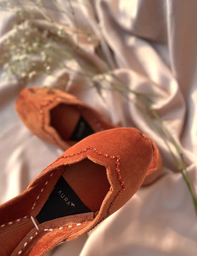 Bliss rust a velvet stuff soft base traditional footwear. Easy to wear and designed with decent small beads. Add charm to your wardrobe and enhance your look.Â