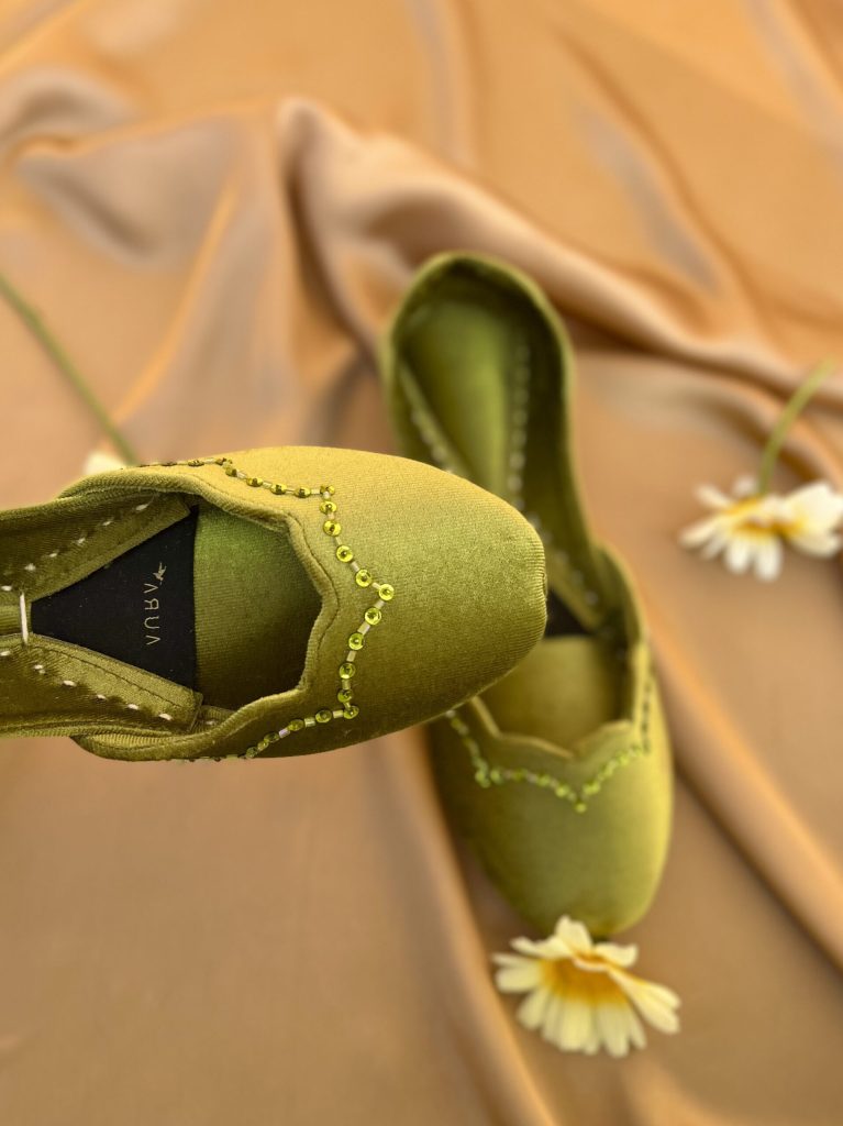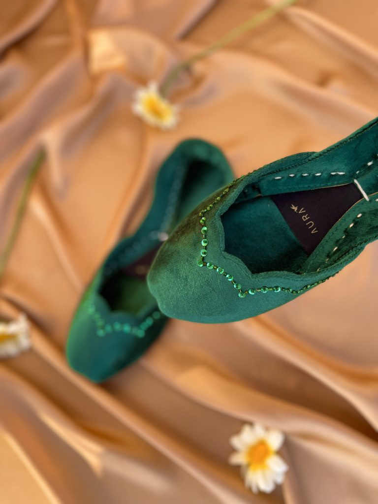 Style and wear our latest bliss emerald green footwear, with small shiny sitaras, beads that look perfectly decent. A comfortable and lightweight soft pair which you can select to align with your event theme. Â