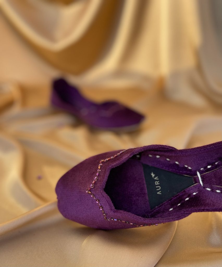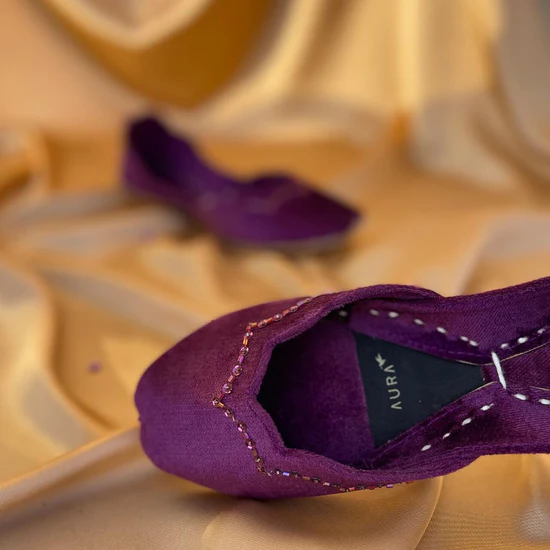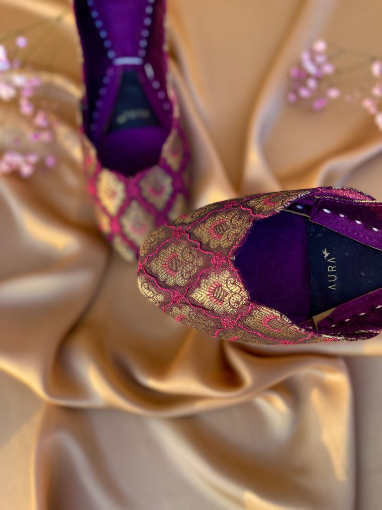 Elevate your style with banno purple traditional footwear. This astonishing pair shows seamless designs created with golden strings. Made from premium material gives you an elegant look with comfort and longevity. The rich purple hue is a perfect fit for casual outfits.Â
