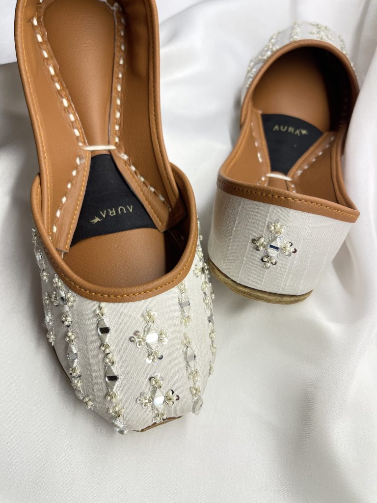 Gulpash a beige hue with different flawless colors, is finely integrated with fancy colorful threads and pearls. The soft padded of this handmade traditional footwear gives you a stylish look with comfort.Â