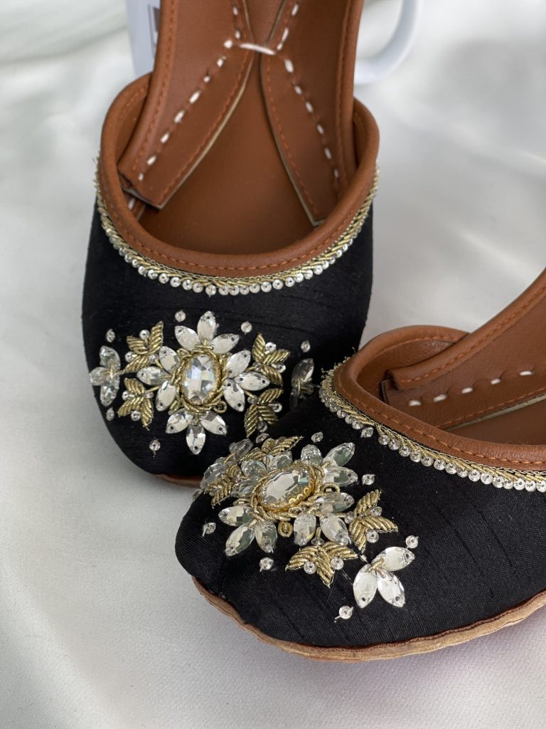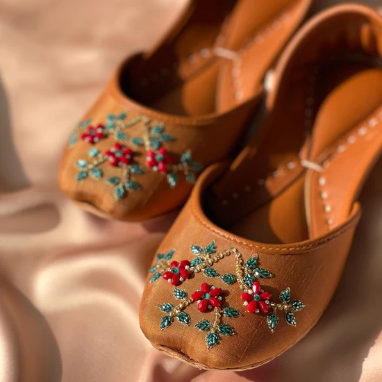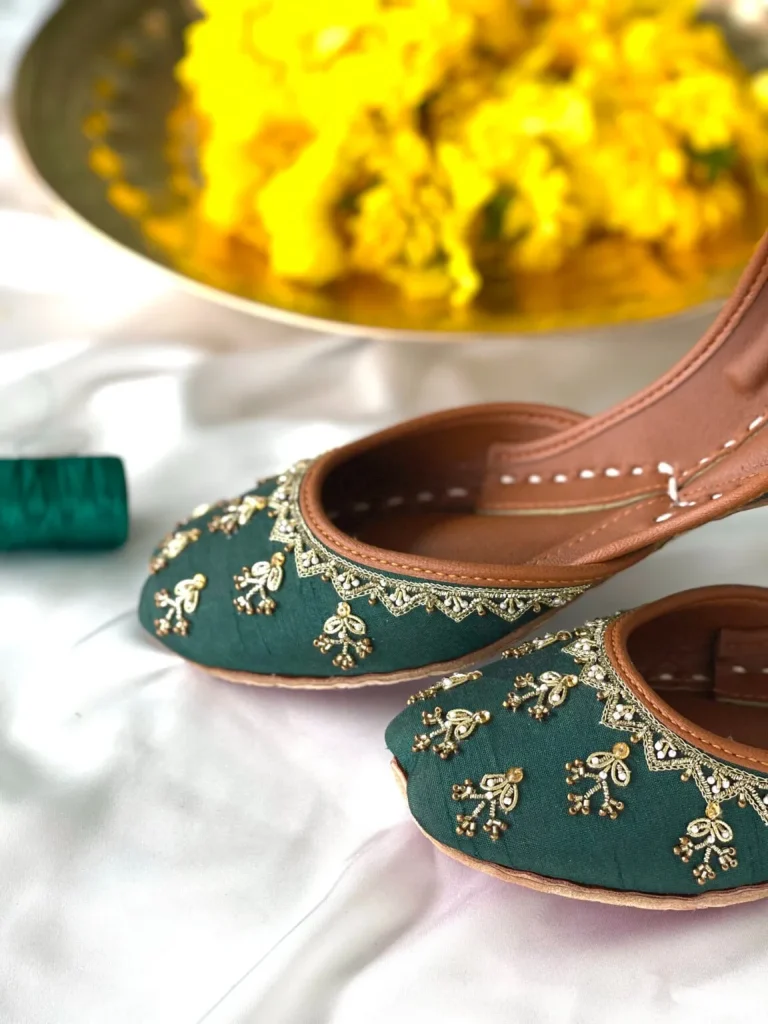 Morni our premium product, a zinc green hue adorned with golden thread and small pearl accents. This hand made decorative pair ensures comfortable and attire walking.Â