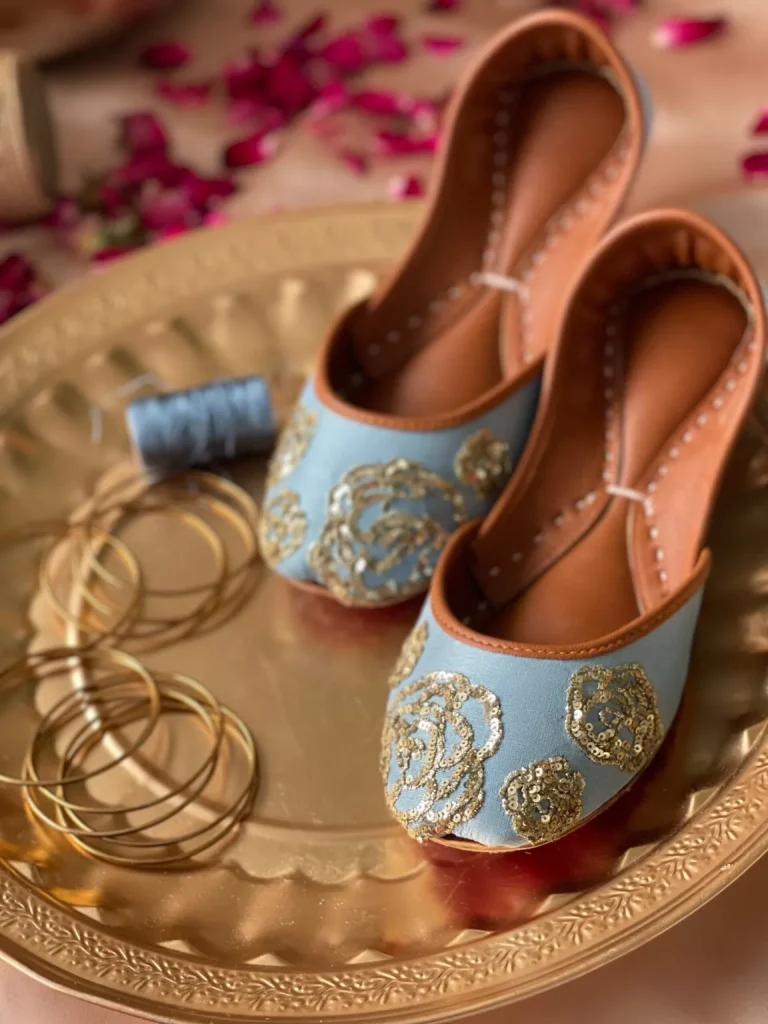 Jalpari, a sky blue pair with sparkling golden sitaras ensures a snug fit for semi formal events. This vibrant design shines in light creating an attractive effect. Add charm to your wardrobe with this charming pair.
