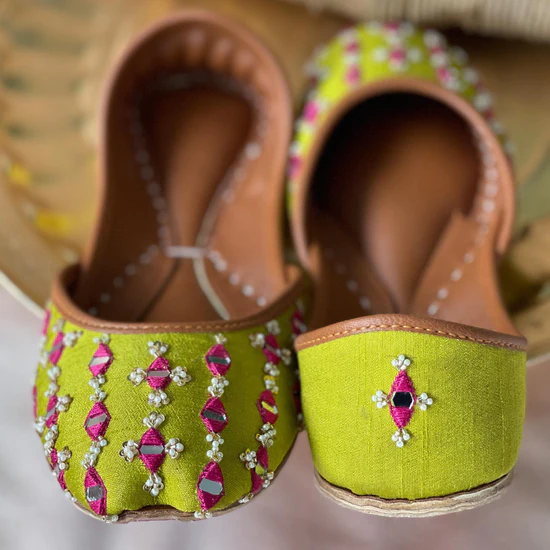 HIRNI A lime green and deep pink pair of Khussa, is duly complemented with sheehsa, pearls , reasham, cut dana and sequin. The padded comfort of this leather khussa comes with luxury aesthetic feel.