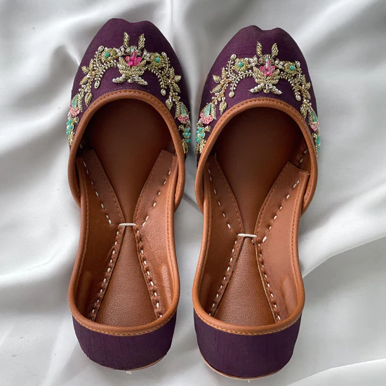 Elevate your style with gul e banafshan purple traditional footwear. This astonishing pair shows seamless designs created with golden strings. Made from premium material gives you an elegant look with comfort and longevity. The purple hue is a perfect fit for fancy outfits.