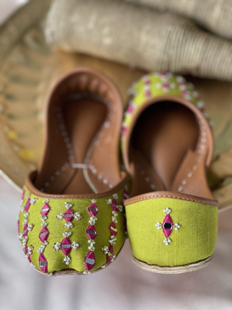 HIRNI A lime green and deep pink pair of Khussa, is duly complemented with sheehsa, pearls , reasham, cut dana and sequin. The padded comfort of this leather khussa comes with luxury aesthetic feel.