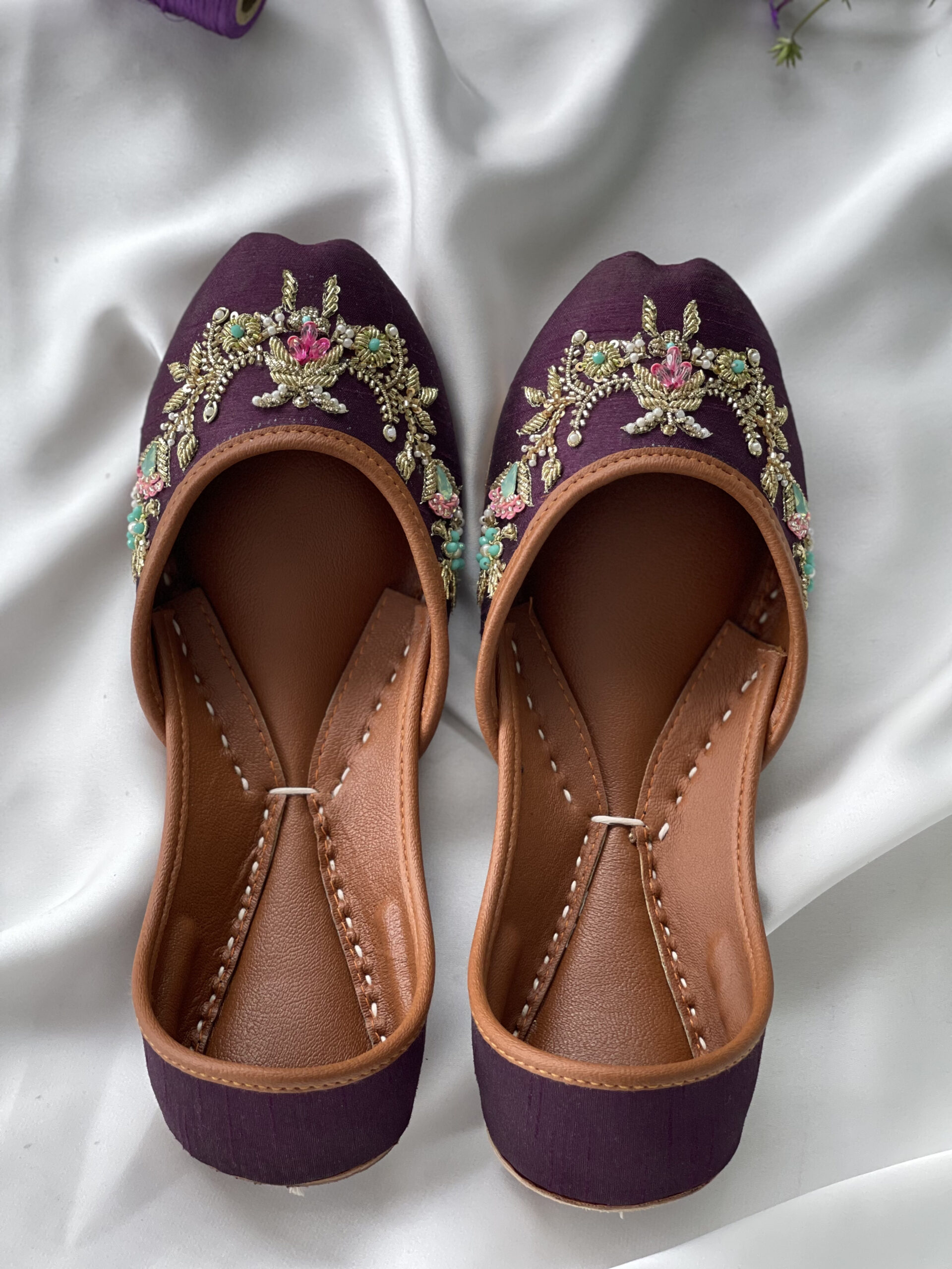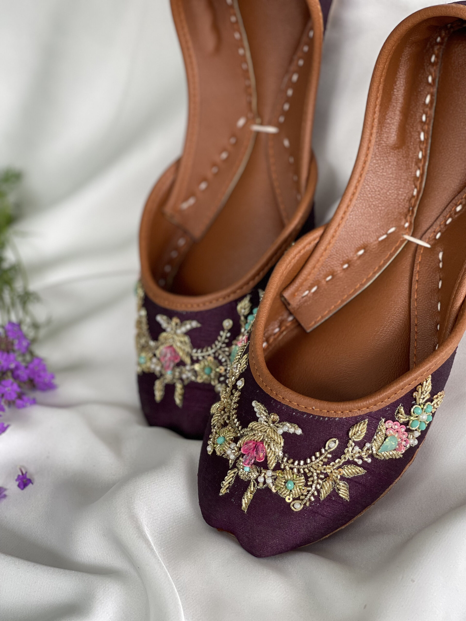 Elevate your style with gul e banafshan purple traditional footwear. This astonishing pair shows seamless designs created with golden strings. Made from premium material gives you an elegant look with comfort and longevity. The purple hue is a perfect fit for fancy outfits.