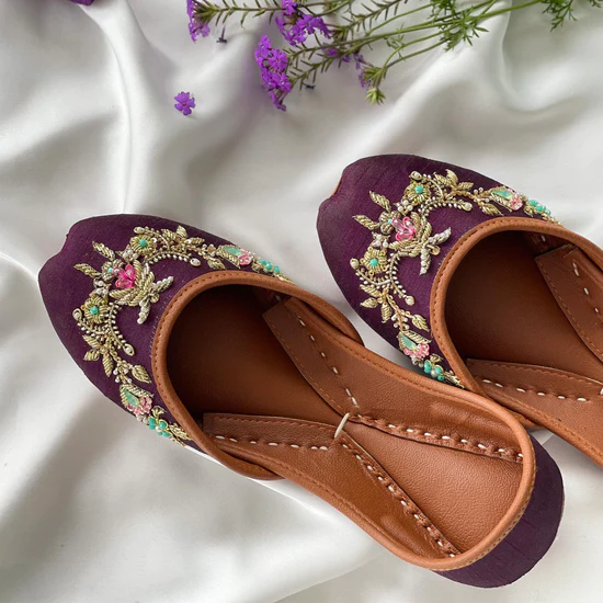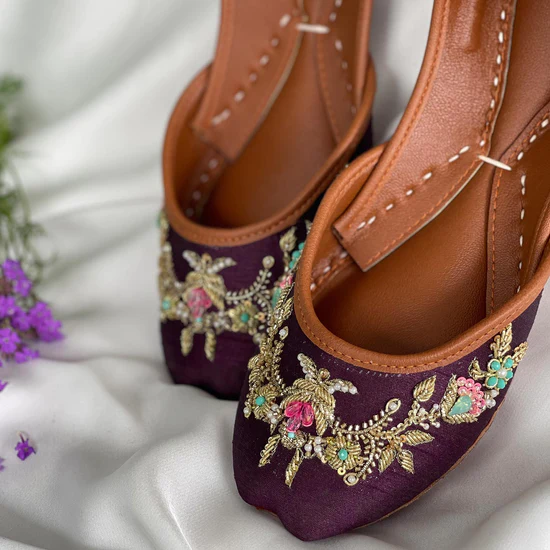 Description:  Gul-e-banafshan a beautifully designed and sophisticated purple khussa, ensembled with pink sequin and turquoise crystals is surely a royal choice. The phool patti made with naqshi, grass crystal, cut dana make this pair a must have article of your wardrobe.