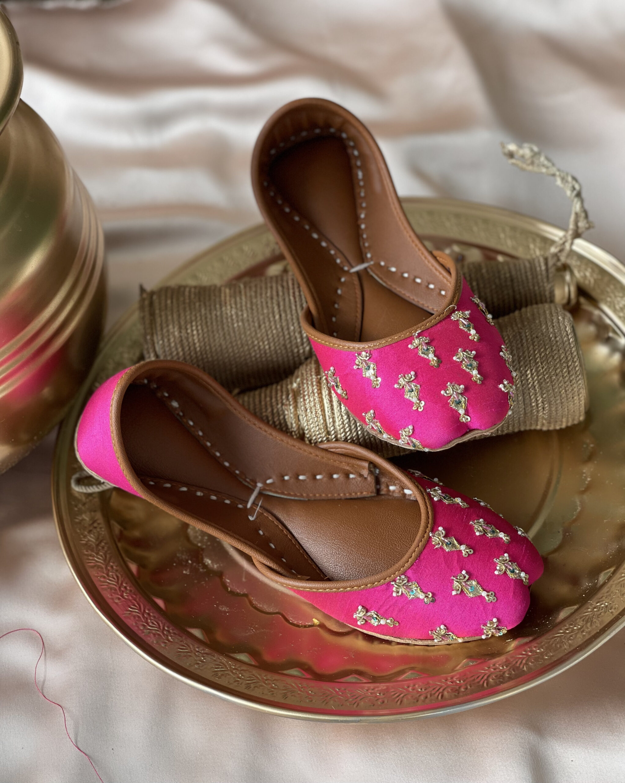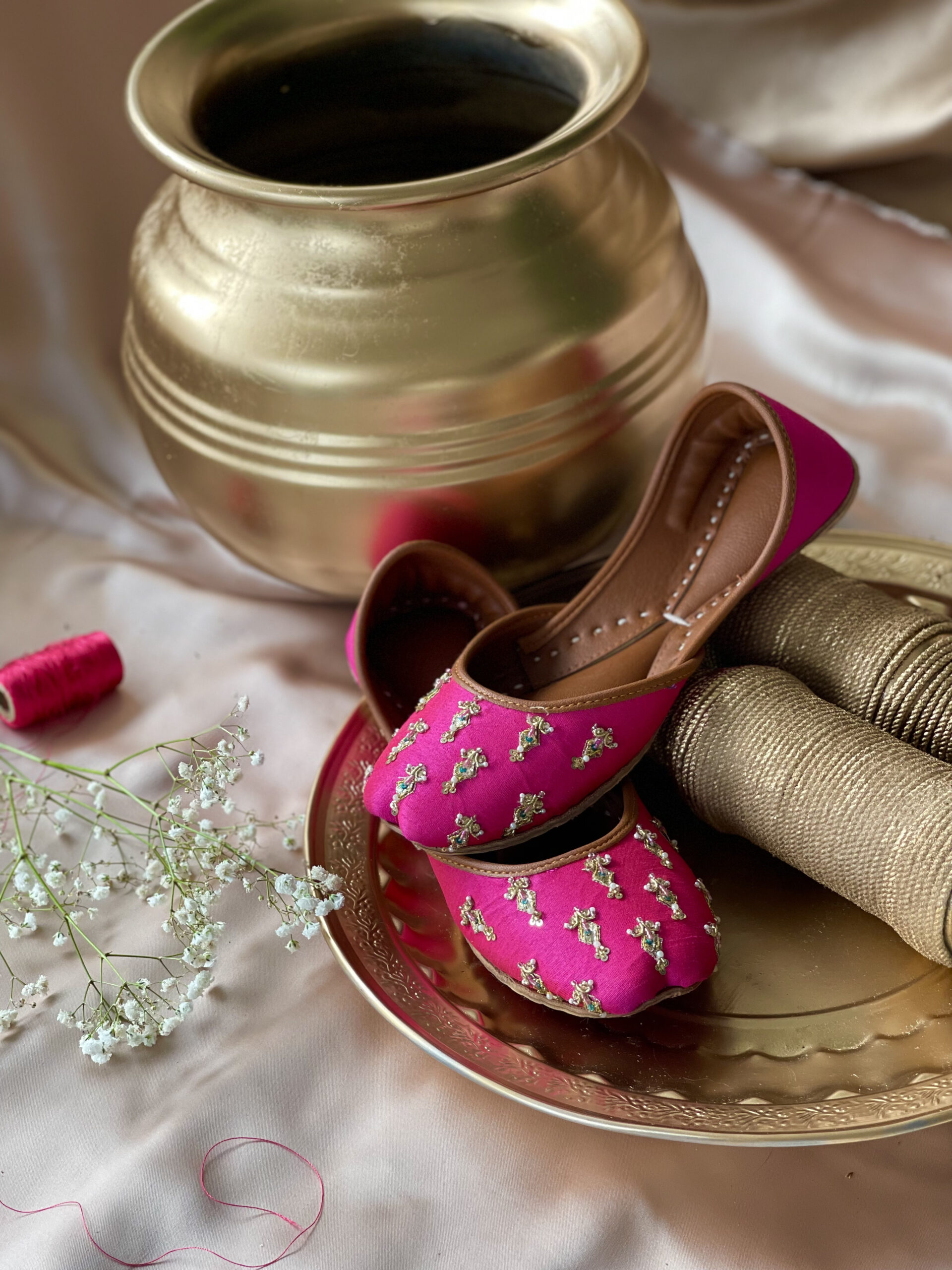 Explore our latest pair maharaani, a shocking pink color with small pearl designs merging style and comfort and elevating productivity. Aura by Aliya crafts traditional footwears with the finest materials made with pure cow leather.Â