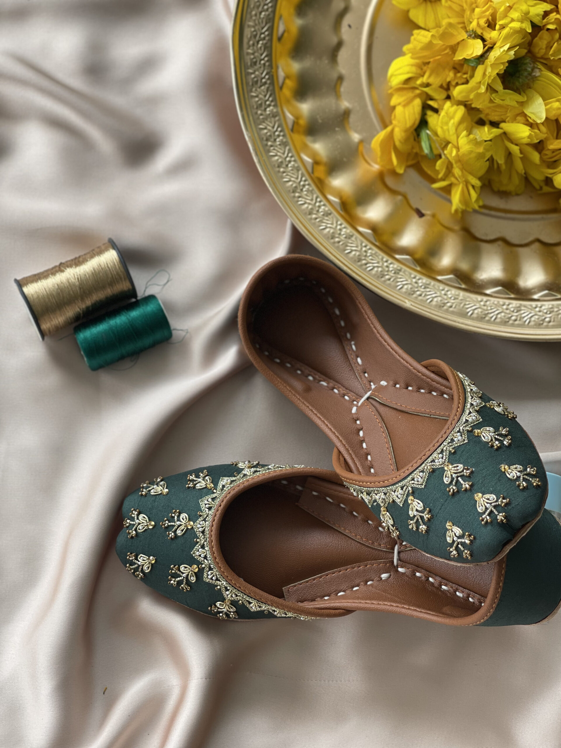 Morni our premium product, a zinc green hue adorned with golden thread and small pearl accents. This hand made decorative pair ensures comfortable and attire walking.Â