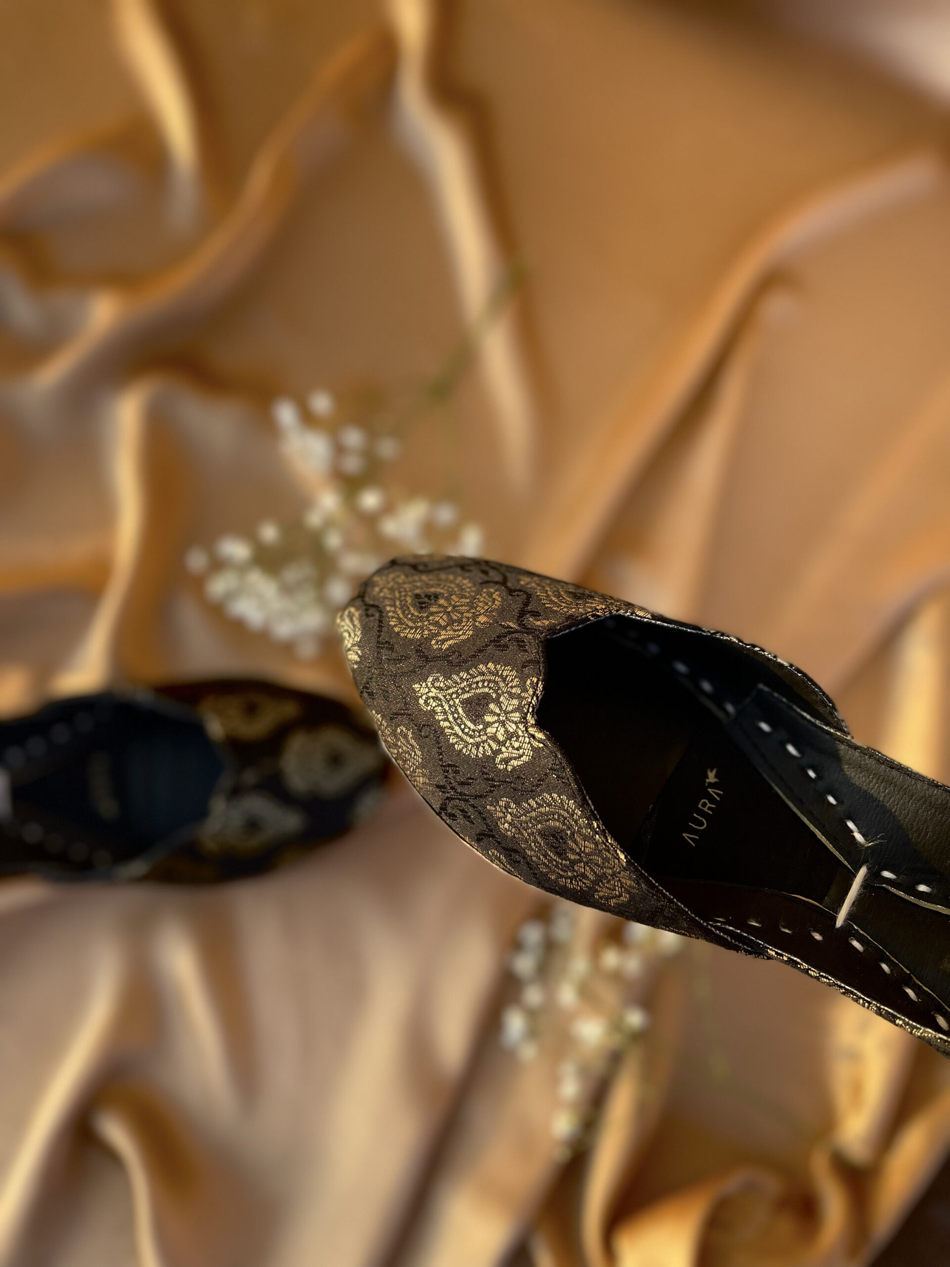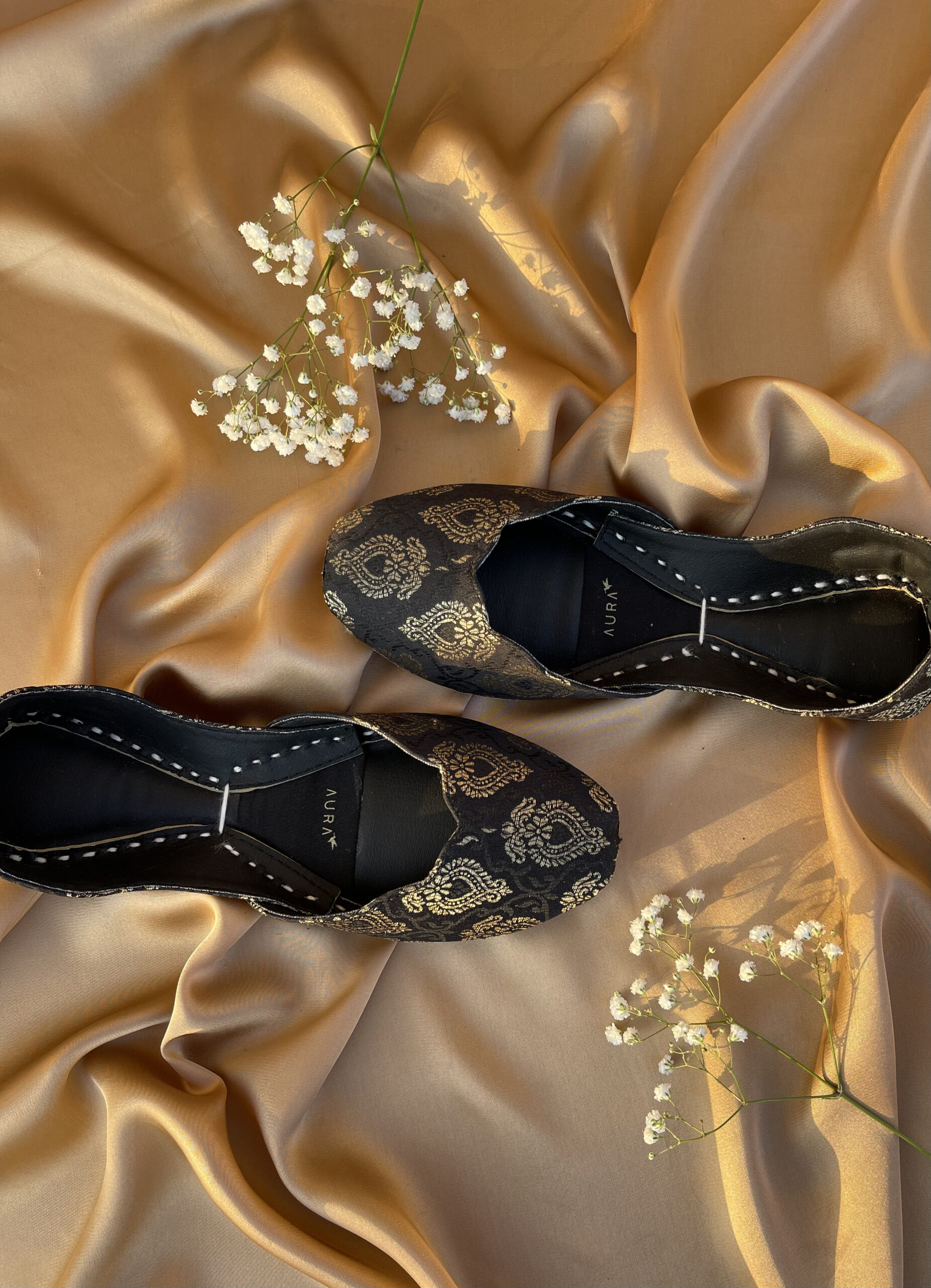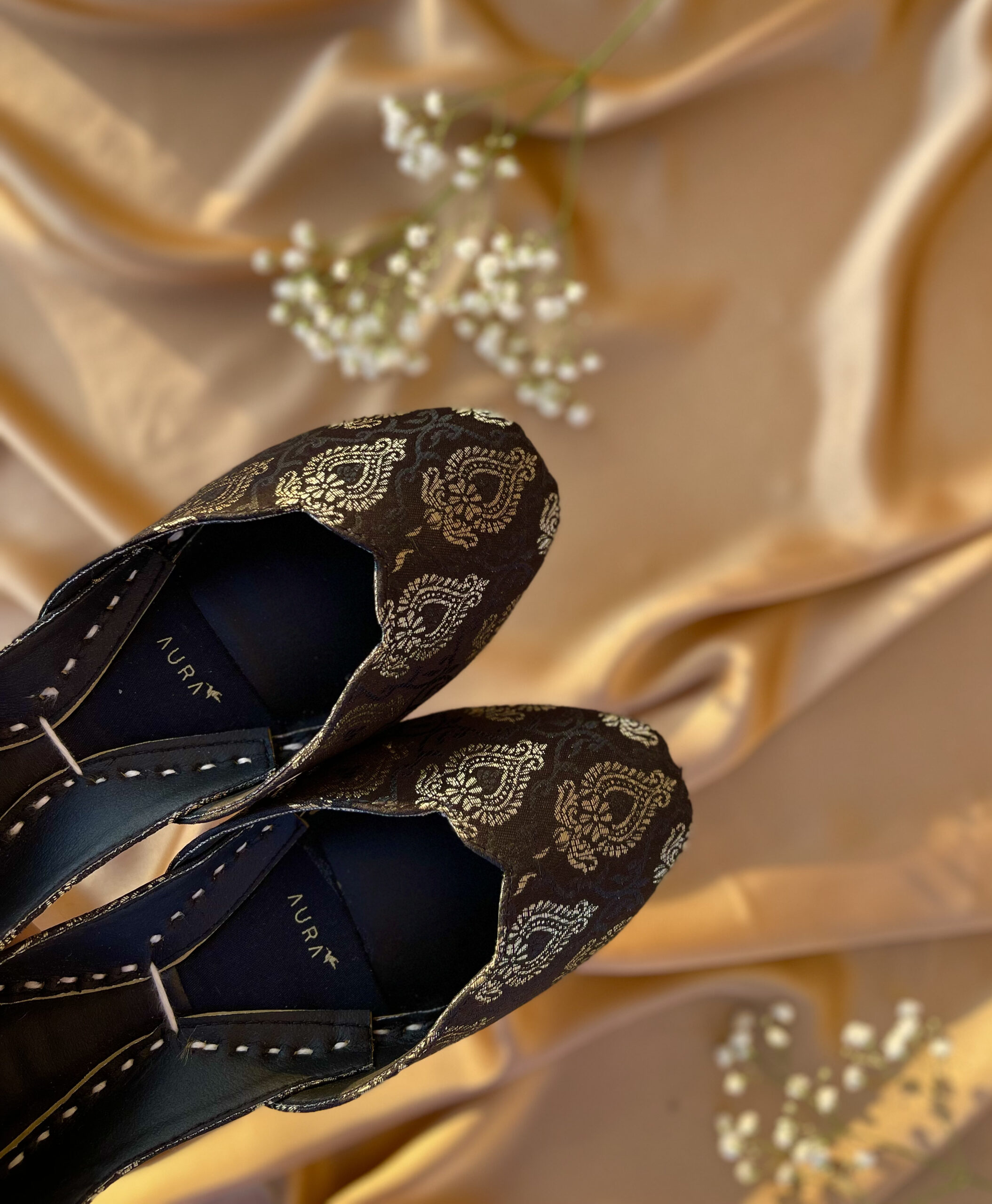 Check out our latest sleek black rassiya. Its black color shade designed with golden threads makes a sweet combination for simple casual occasions. We smoothly integrate style, luxurious, and ethnicity in one pair.Â