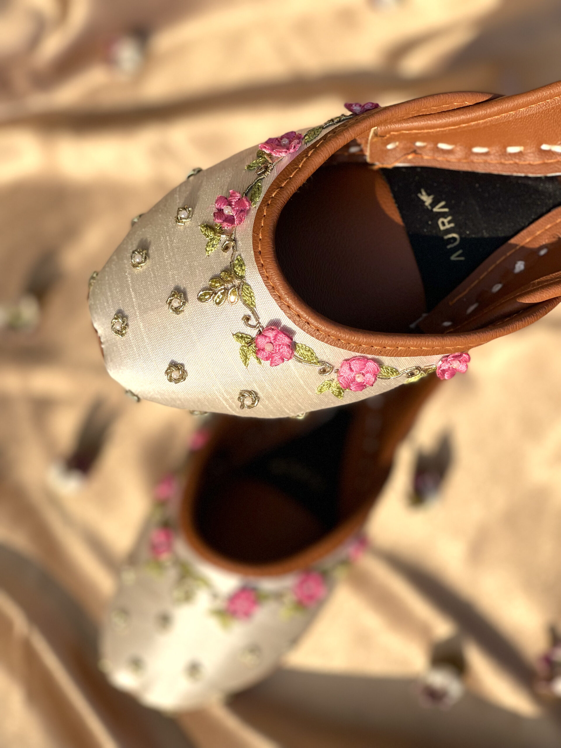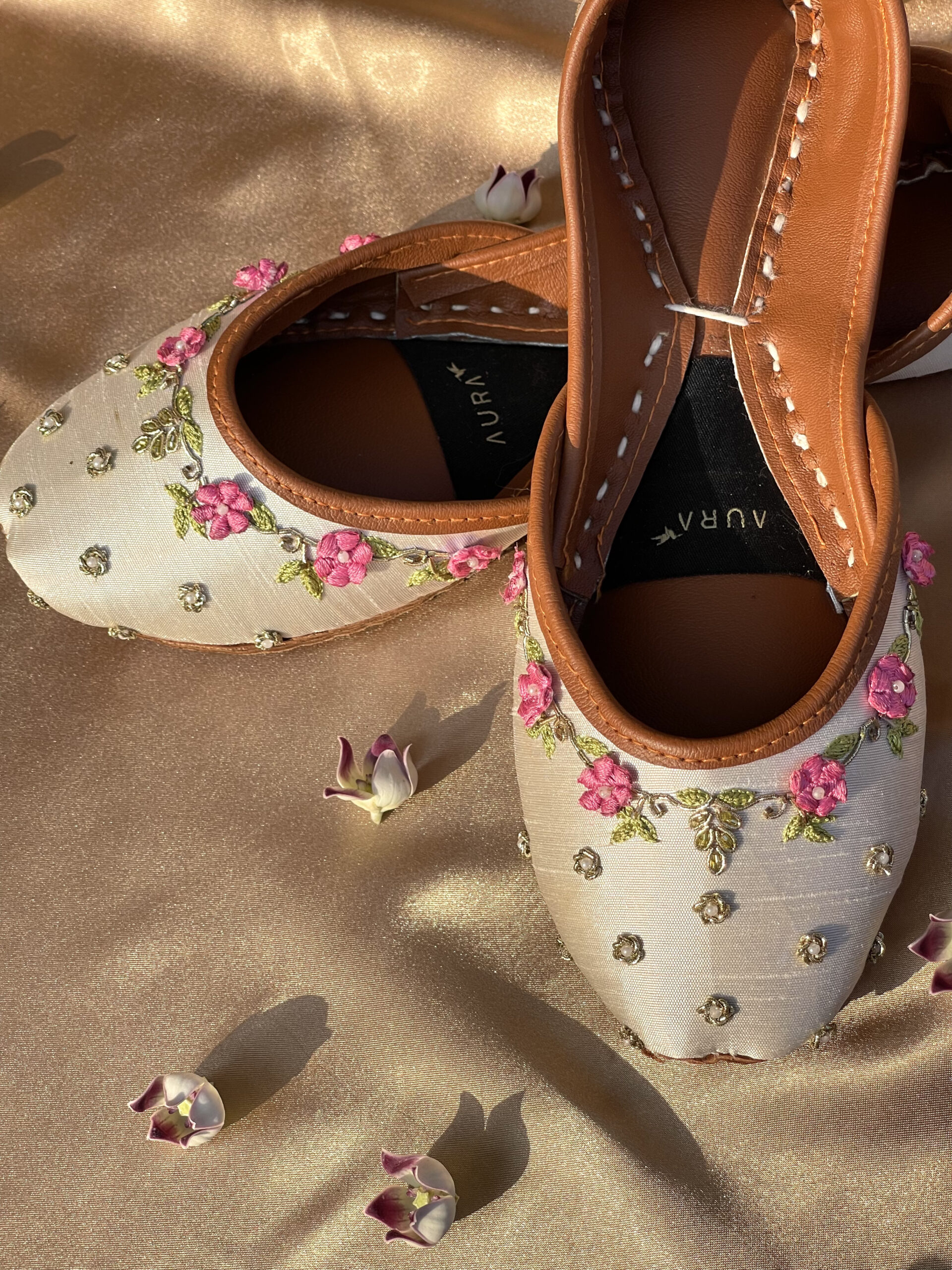 Discover the aura by Aliya new arrival seep, a white hue with small pink flowers. Sleek white pearls adorned on it amazingly give a perfect vibe for weddings and general events. Hand-crafted soft bases give you much comfort and ease.