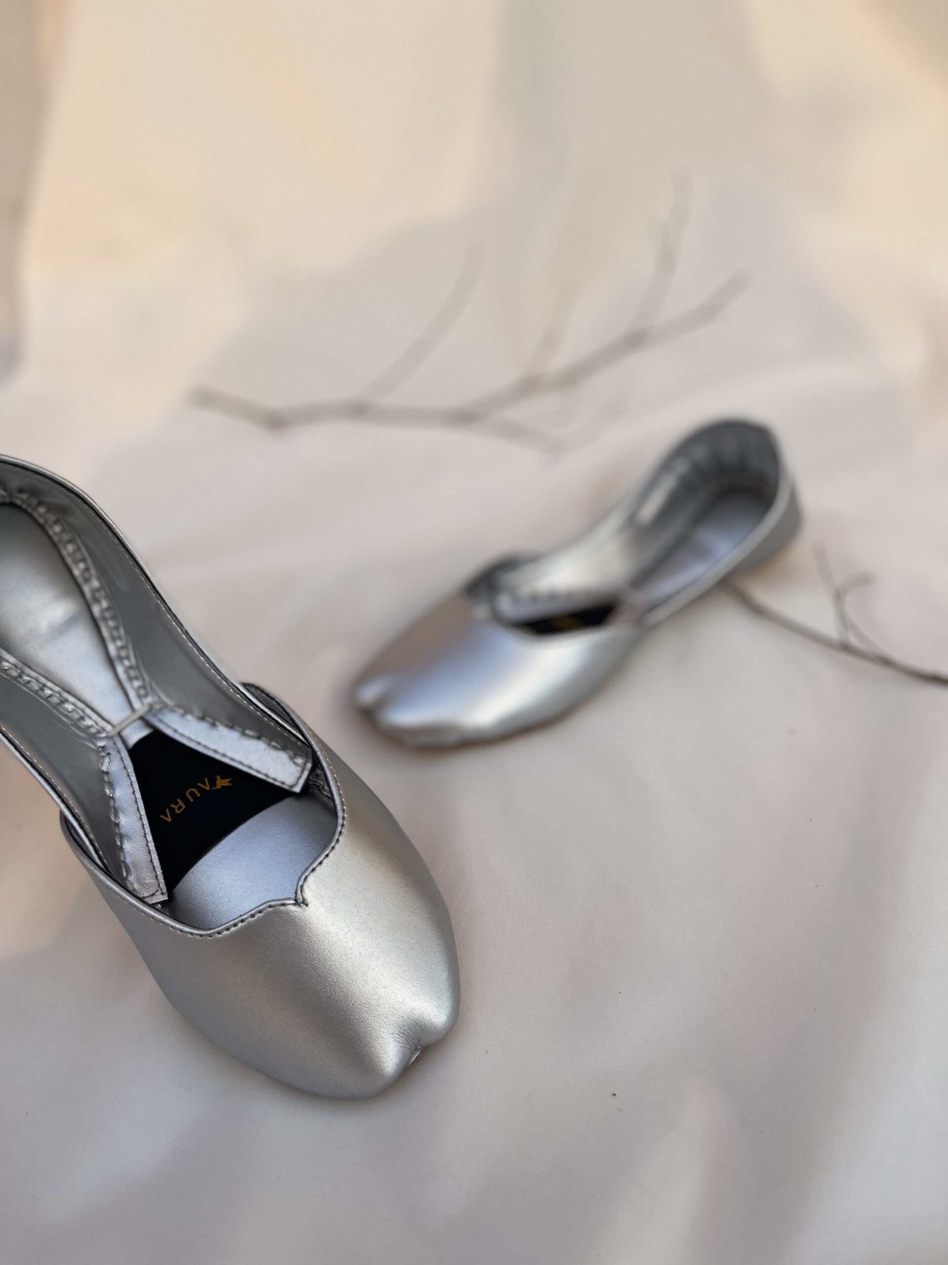 Explore our new elegant pair of silver from solids, plain decent shiny khussa, and can style up with a variety of your outfits. Order now and show subtle glam.